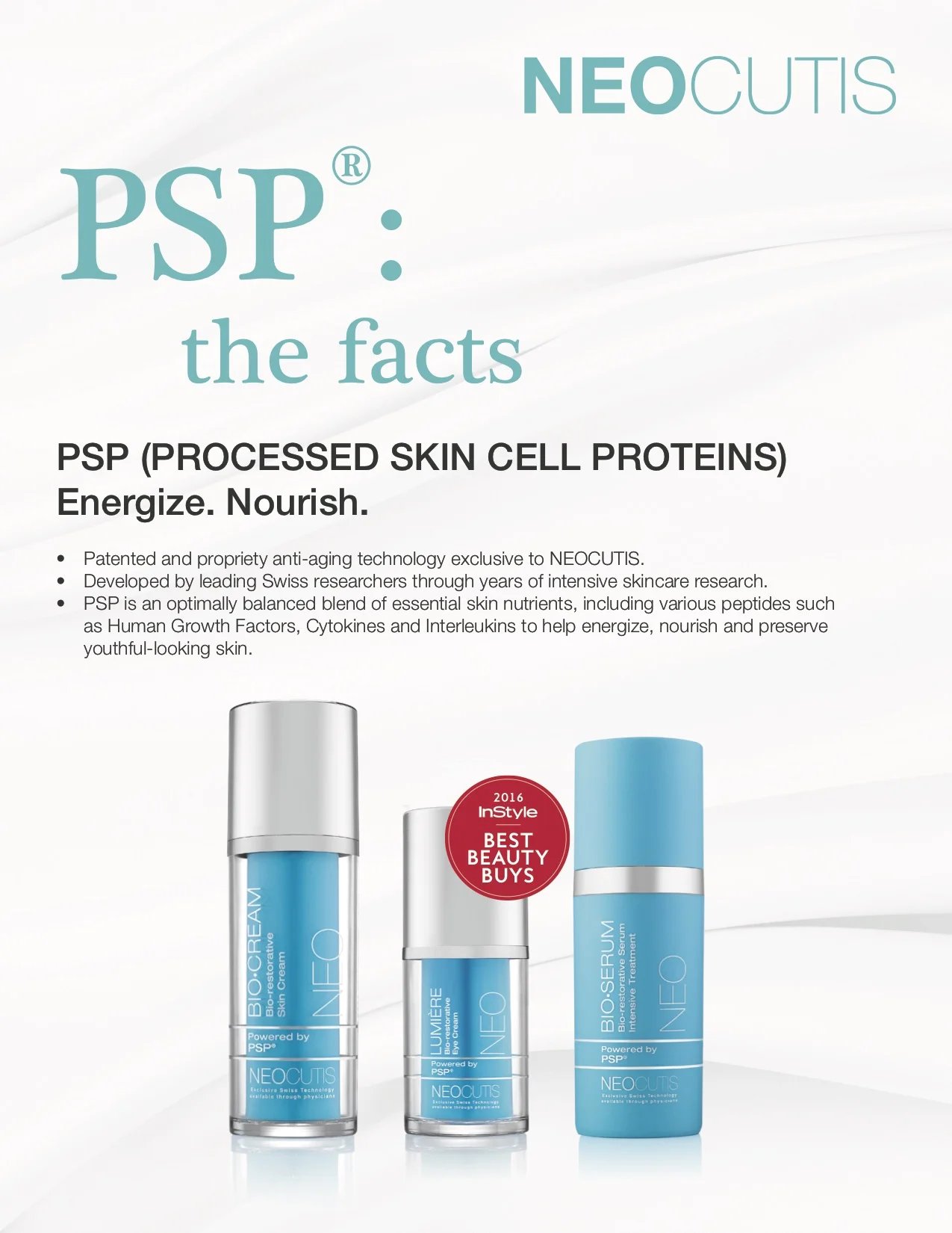 An intensive bio-restorative skin care line, developed by leading Swiss researchers, is formulated with a rich balance of PSP(processed skin proteins such as human growth factors, cytokines and Interleukins) which helps preserve collagen and elastin fibres, aids in reducing and preventing fine lines and wrinkles, refines the texture of skin and moisturizes giving skin a more radiant appearance. Contains 0.5% hyaluronic acid to rehydrated dry skin. Noticeable results in 7-14 days.
